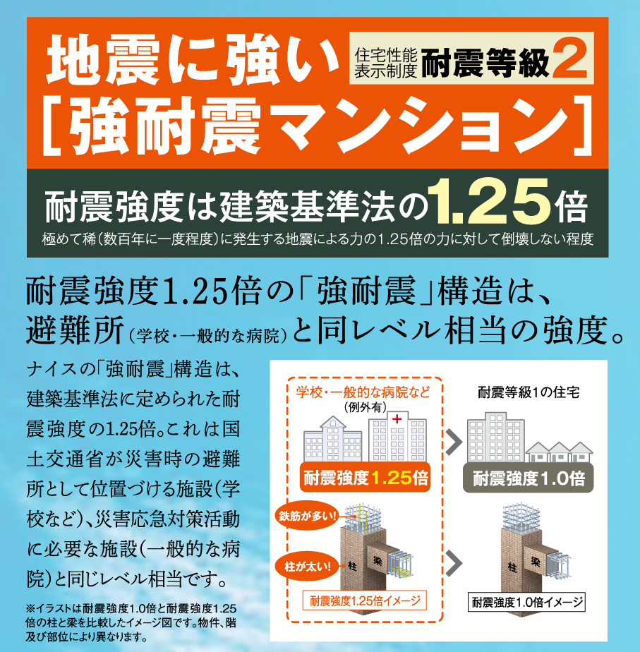 マンションができることは、何よりも耐震性能を高めることです。日本では過去の大震災のケースなどから、地震の揺れに強い構造を造る世界でもトップレベルの耐震設計基準が設けられています。ナイス株式会社では、この基準に対して1.25倍の耐震強度で、数百年に一度起こる大地震に対して安全を確保した構造を「強耐震構造」と称し、マンション建築を進めており、「ナイスグランソレイユ横濱綱島」も「強耐震構造」を採用しています。