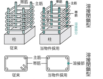 建物を支える全階の柱の帯筋にはスパイラル筋を採用しました。つなぎ目が少ないため、地震の際の横揺れに強い構造になっています。(一部除く)