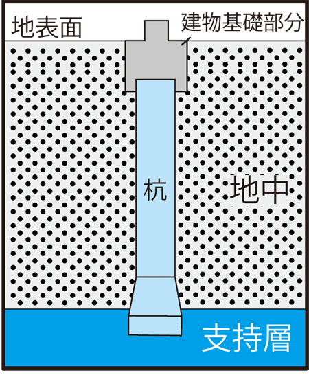 基礎工事に採用している場所打杭の「拡底アースドリル工法」は建築現場で、特殊ドリル(アースドリル)を使い、支持地盤まで掘削してから、支持層内で先端支持部分の杭径を拡大した安定性のある杭です。(一部除く)