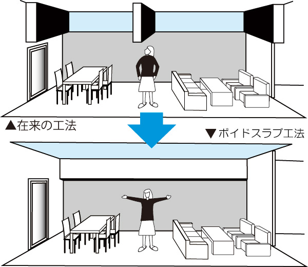 天井の小梁が少なくなり、すっきりとした空間でインテリアがより自由に楽しめます。(一部除く)